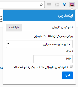 عملیات فالو کردن کاربران از دو بخش استخراج اطلاعات کاربران و ارسال درخواست فالو تشکیل می شود. در حال حاضر دو روش برای استخراج کاربران در نظر گرفته شده است که شامل جمع آوری فالورهای صفحه جاری و جمع آوری از پست های صفحه جاری (لایک ها و کامنت ها) امکان پذیر است.