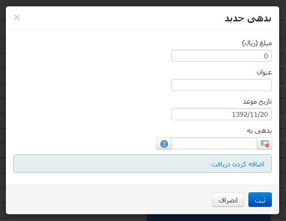 برای نگهداری میزان طلب هایتان از دیگران و یا بدهی هایتان به دیگران می توانید در نرم افزار بدهی و طلب ایجاد نمایید. این بدهی و طلب می تواند بابت گرفتن قرض از دیگران یا دادن قرض به دیگران و یا بابت خرید کالا و خدمات از دیگران یا فروش کالا و خدمات به دیگران باشد.