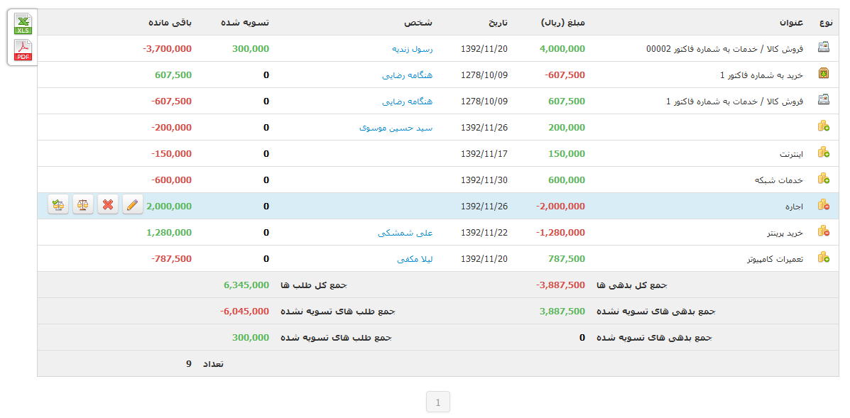 در صورت نیاز می توانید لیست بدهی ها و طلب ها را بر اساس آیتم های گوناگون فیلتر کرده و از این لیست فیلتر شده خروجی اکسل و پی دی اف تهیه کنید.